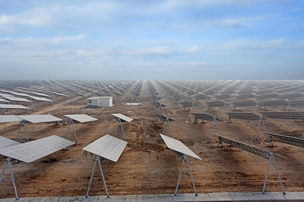 寧夏中衛(wèi)并網(wǎng)光伏電站總規(guī)模:太陽(yáng)能光伏電池組件裝機(jī)容量共60MWp,一二期電站工程采用恩菲自主研發(fā)的8°角斜單軸智能柔性聯(lián)動(dòng)追日跟蹤系統(tǒng),于2011年12月并網(wǎng)并投入運(yùn)營(yíng);三期電站工程采用固定式支架安裝方式,于2013年1月并網(wǎng)并投入運(yùn)營(yíng)?! ≡擁?xiàng)目主要特點(diǎn)包括:一、二、三期工程均利用綠色能源——太陽(yáng)能發(fā)電技術(shù),該技術(shù)綠色無(wú)污染;其中一期二期工程采用自主研發(fā)的智能聯(lián)動(dòng)跟蹤系統(tǒng)的方式,對(duì)比國(guó)內(nèi)已投產(chǎn)的同規(guī)模光伏電站,該工程技術(shù)先進(jìn)、國(guó)產(chǎn)化程度高、投資??;配置了跟蹤系統(tǒng)智能監(jiān)控畫(huà)面,全面實(shí)現(xiàn)電站智能化管理并大大提高了電站的綜合效益。